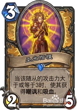 圣光表率-侍从(2 / 5)当该侍从的进犯力年夜于或等于3时,使其获得嘲讽和吸血。