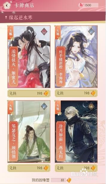 另一种是经由过程兑换的体例获得更高级的天赐卡牌,在结缘页面点击右上角的姻缘签商铺,就可以利用姻缘签兑换天赐卡牌了。