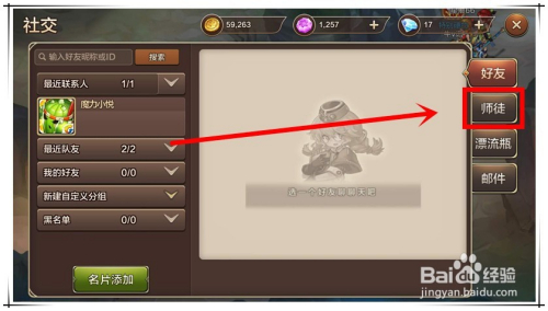 在打开的“社交”窗口中,点击右侧的“师徒”选项卡,切换到“师徒”办理页面。