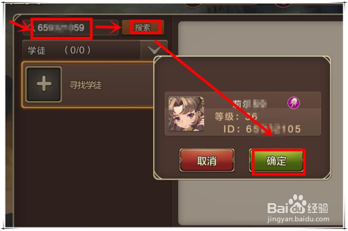 在打开窗口左侧的搜刮文本框中,输入要招收门徒的ID号,点击“搜刮”按钮,搜刮到后,会弹出如下图所示提醒窗,点击“确定”标的目的该ID脚色发出招收门徒请求,然后期待对方回应,若是接收请求,则招收门徒当作功。