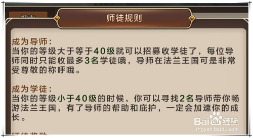 当你门徒的品级达到10、20、30、40、50、60级时,导师可以获得必然数目的技术草,而学徒的奖励比拟导师却更为丰硕。