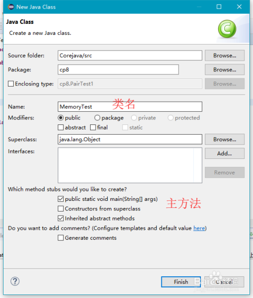 在弹出来的“New Class”中,可以对欲添加的通俗类的类名和实现的接口进行界说,注重要合适Java标识符的定名法则,可以就定名为“MemoryTest”,可以选择勾选上本家儿方式“public static void main(String[] args)”