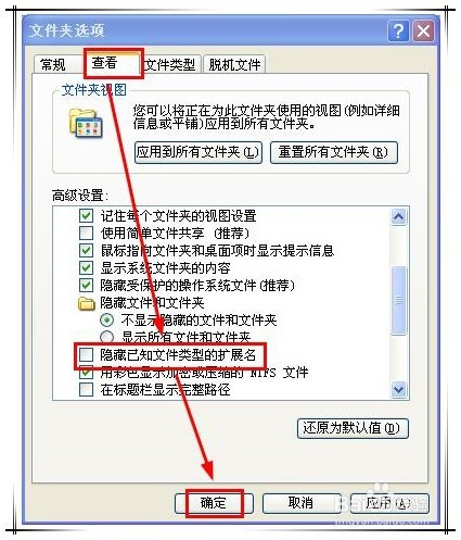 在文件夹选项窗口,依次如下图所示点击“查看”——不勾选“埋没已知文件类型的扩展名”选项前的复选框——“确定”保留退出。