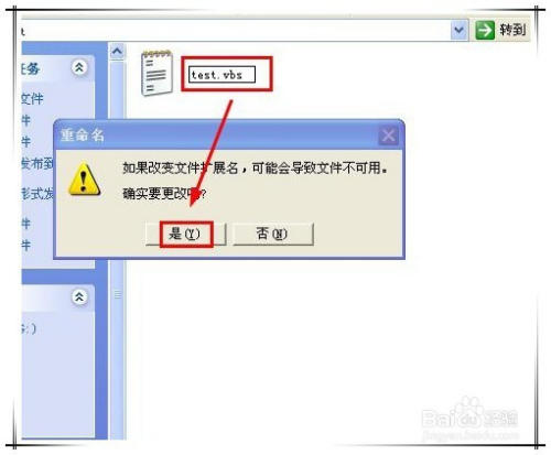 这时test.txt文件名酿成可编纂状况,将test.txt更名为test.vbs后回车,或鼠标单击其它处所,就会弹出重定名提醒框,提醒你点窜了文件扩展名,可能会导致文件不成用。不消理会它,直接点“是”继续点窜。
