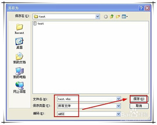 在"另存为”对话框中,在“文件名”、“保留类型”、“编码”后,依次填写(选择):“test.vbs”、“所有文件”、“ANSI”(不含引号),确认无误后点“确定”保留。