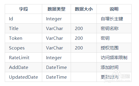 API密钥表,存储拜候REST API的密钥。
