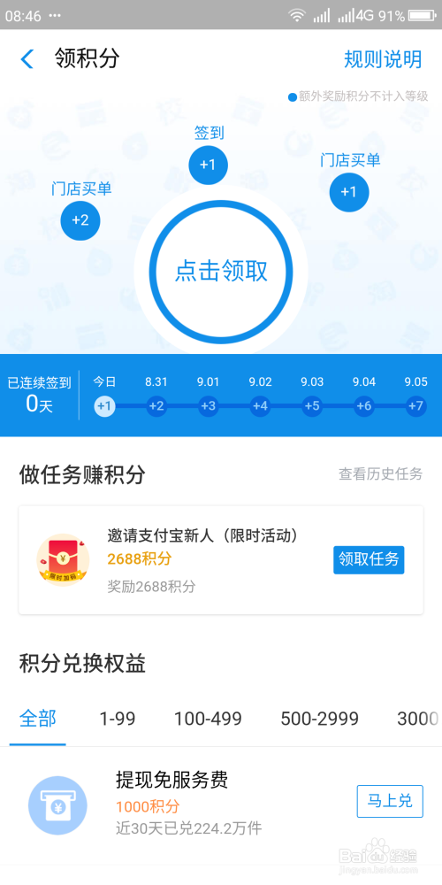 在领积分页面最上面,只要我们有效付出宝付出过的,就可以看到有几个领积分项目。我们可以依次点击领取,也可以直接“点击领取”,点击一次,可以领取一种积分。