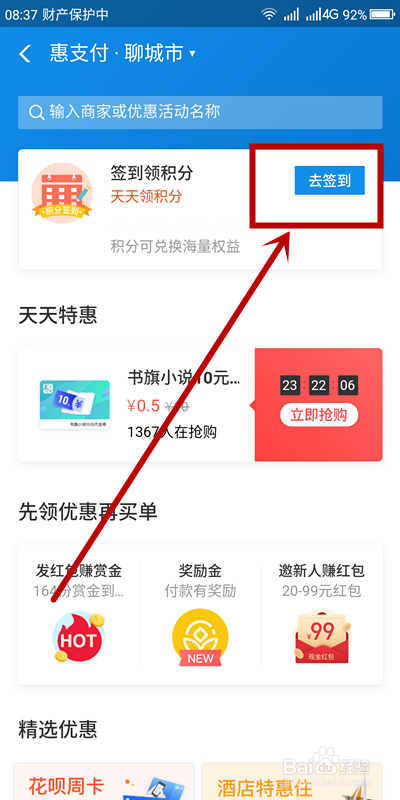 在惠付出页面,显示了你地点的地域。我们找到下面的“签到领积分”,点击“去签到”