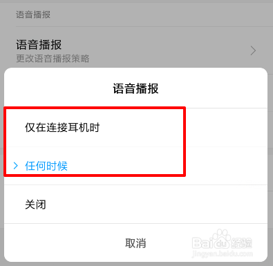 点击今后,可以看到语音播报的时候,我们可以选择任何时辰,也可以选择在毗连耳机时辰利用该功能。