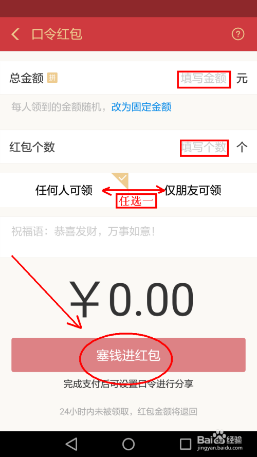 在口令红包写上金额,个数,选择伴侣或任何人,填写好后点击”塞进红包“。(如下图)