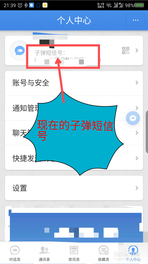 打开枪弹短信软件后,点击右下角的小我中间。如图所示