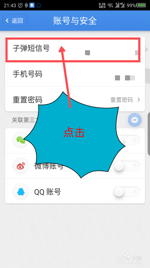 打开账号与平安后,点击最上面的枪弹短旌旗灯号。如图所示
