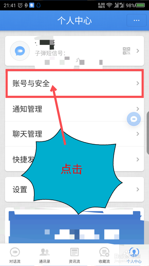 此刻要去点窜,就先点击下面的账号与平安。如图所示