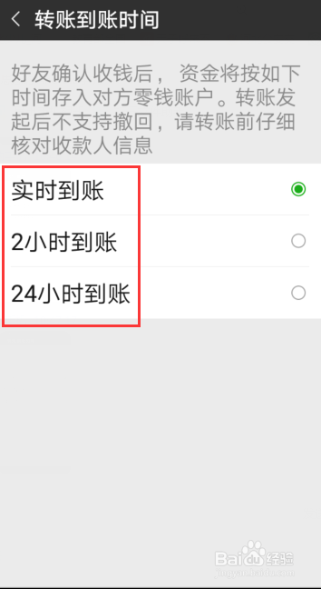 在这里你可以设置及时到账、2小时到账、24小时到账等三个选择。