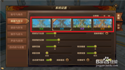 在画面选择中今朝有四种画面,若是感受到玩游戏卡的话就下调一个品质的画面,一般选择【流利】就可以。