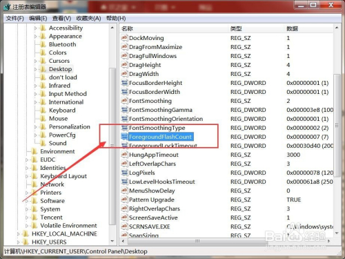 接下来,我们双击打开Desktop子项,然后在其子项的右侧页面中找到“ForegroundFlashCount”设置项,双击打开该子项。