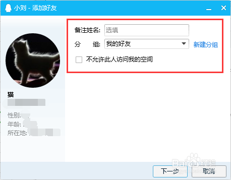点击“下一步”后,会弹出一个分类的对话框,给你的老友设置一个备注信息,便利下次找到,也可以给老友分一个组,将分歧的老友进行归类