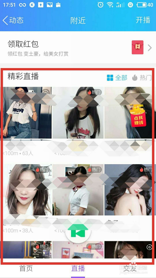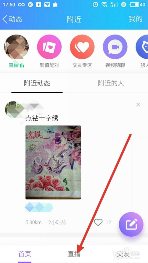 在四周的动态中,点击“直播”