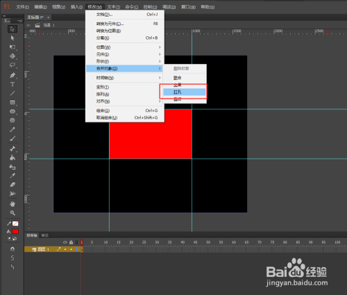 单击图层1的第一个关头帧,将图层1中的所有对象都进行选中;然后打开点窜菜单,找到并执行归并对象中的打孔号令,执行完该号令之后,中心的红色矩形就消逝了。
