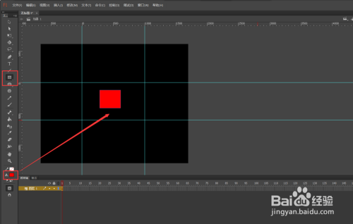 选中选择东西用鼠标左键在黑色矩形之外的处所单击一下,使得鼠标处于无选中对象状况;然后切换选中矩形东西,将矩形东西的填充颜色改为红色,然后利用矩形东西在舞台中心画出一个肆意大小的小矩形出来。