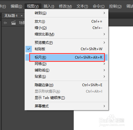 找到菜单栏中的视图菜单,在视图菜单中找到标尺号令,将标尺进行勾选;勾选之后我们就看到在舞台与东西栏和菜单栏的鸿沟处就呈现了近似尺子的工具,这就是标尺。