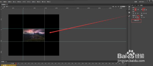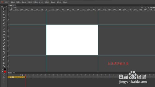 切换到东西栏中的选择东西,将鼠标移到标尺上,然后按住鼠标左键不松依次退出下上的两条和摆布的两条辅助线出来,并将这四条辅助键都贴紧舞台的四个边。