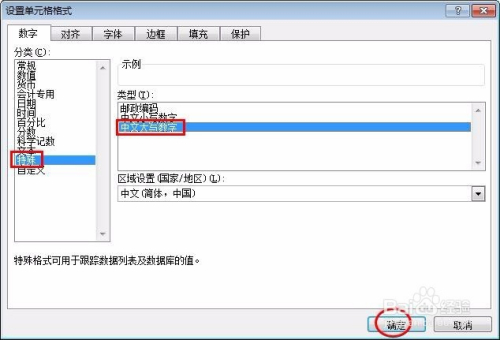 第五步:选择“特别”中的“中文年夜写数字”,并单击“确定”按钮。