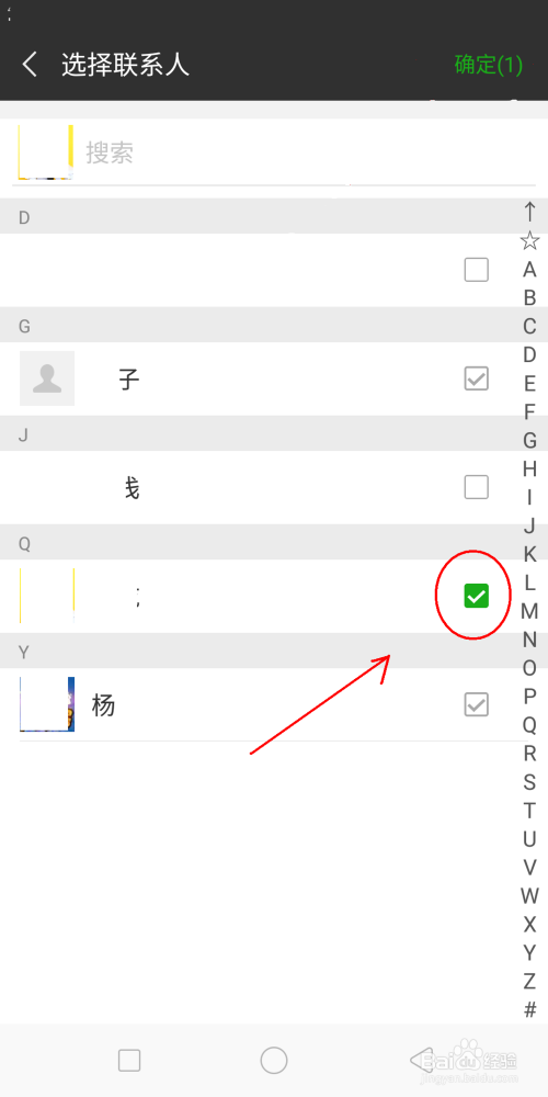 选择联系人,注重没显示颜色,名字后有个”√“,暗示这小我在此群里,不消选择。