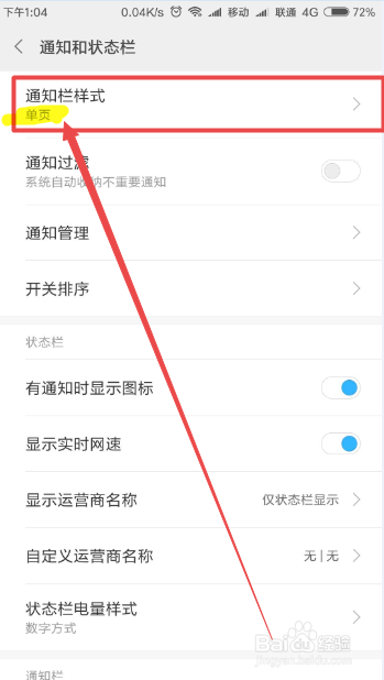 然后在打开的通知和状况栏页面中可以看到一个 通知栏样式 选项,它是单页的。