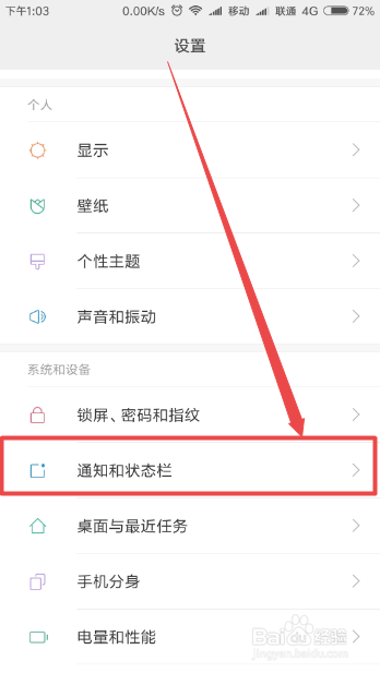 然后在打开的设置页面中点击 通知和状况栏 选项。