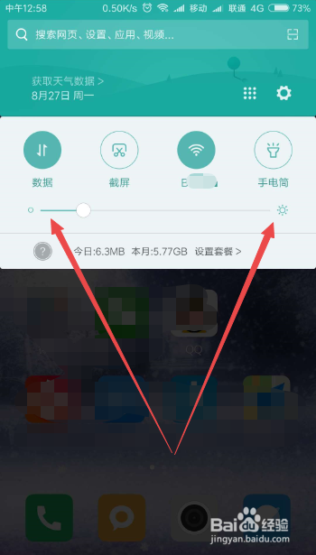 解锁之后,将从上往下滑脱手机的屏幕,在呈现的下拉开关中,可以看到开关只是显示一部门,没有全数显示出来。