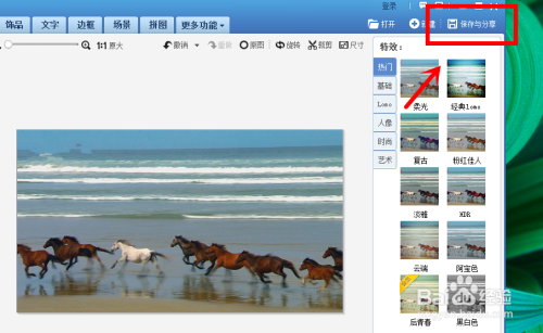 随后,我们经由过程选择页面右上角的保留与分享来保留所点窜的图片即可。