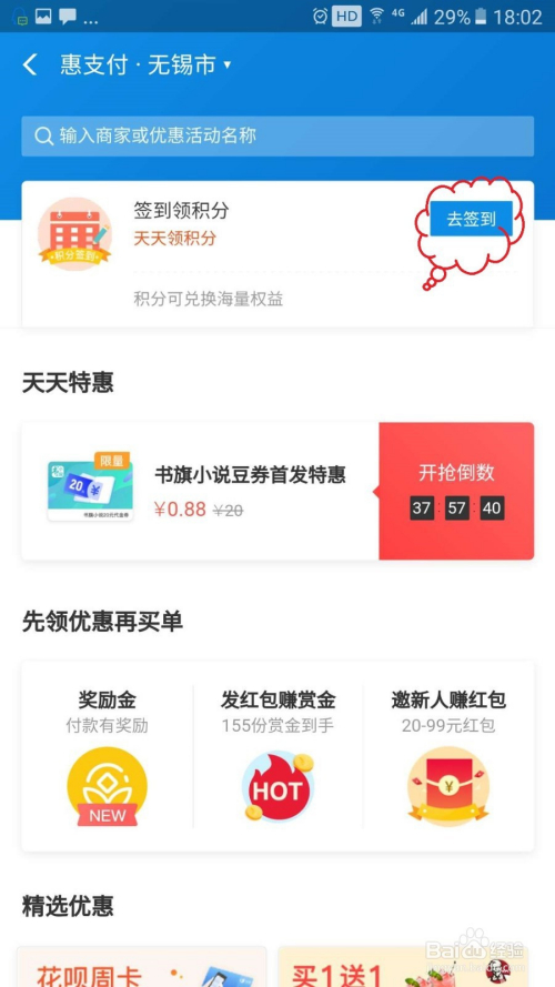 呈现付出宝页面,点击云线标注的惠付出下面的“签到领积分”。