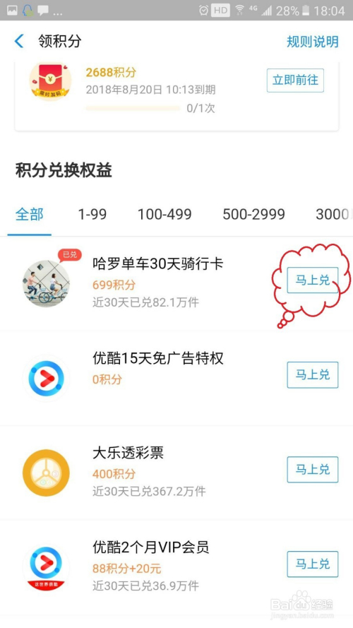 看到“哈喽单车30天骑行卡的”文字和图示,点击右边的“兑换”按钮。