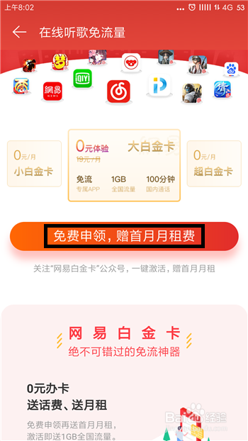 点击后会进入到网易白金卡的相关营业介绍,领会后点击【免费申请】。