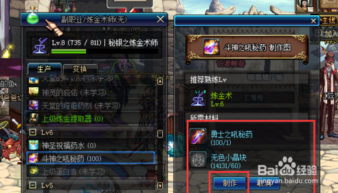 在建造页面点击建造,每个斗神之吼秘药,需要材料1个勇士之吼秘药+60无色小晶块。