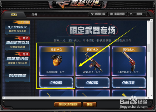 下拉页面,找到——限制兵器专场,在其列内外找到——罕见永远-迅捷手雷,点击领取即可;