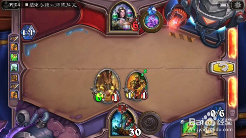 利用英雄技术增添自身护甲,排出两张“狞恶的狼人”,用“盾牌猛击”进犯“暴动狂兵士”,利用“旋风斩”全体进犯,用两个“狞恶的狼人”进犯敌方侍从,暴动狂兵士进犯敌方英雄。