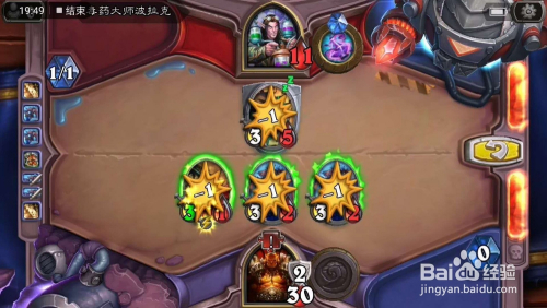 如下图所示,首先,出阵的“石牙野猪”和“蓝腮兵士”交叉进犯对方的侍从,然后肆意选择两张卡牌,放到“火舌图腾”两侧,然后别离对敌方英雄进行进犯,进犯完当作后,将最后一张卡牌,放到“火舌图腾”的一侧,然后继续进犯敌方英雄,获告捷利。