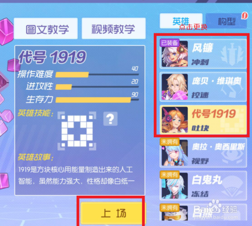 在右边这一栏最上是当前进场的方块,以及它的配技,然后轻点想要换的阿谁,就会给出它的称号了。