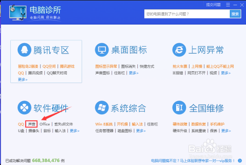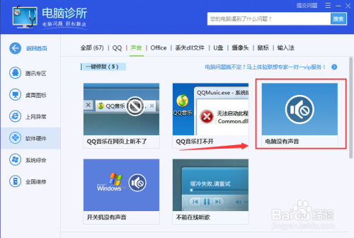 进入电脑诊所,然后我们可以看到软件硬件栏目里面有个“声音”选项,点击进入。