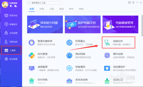 打开电脑管家,在东西箱里面找到“电脑诊所”。