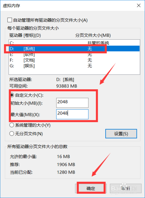 操作五:点击自界说大小,将初始值设置为2048,完当作后点击设置,操作图片步调如下。
