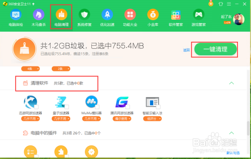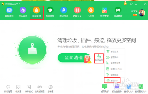 打开平安卫士,点击“电脑清理”,在“单项清理”内选择“清理软件”,如图: