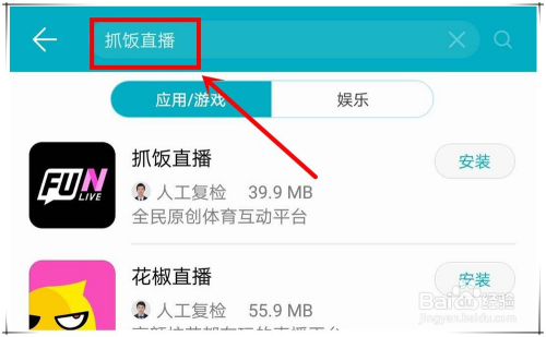 2.在“应用市场”搜刮栏中,输入“抓饭直播”做为关头字,进行软件搜刮。