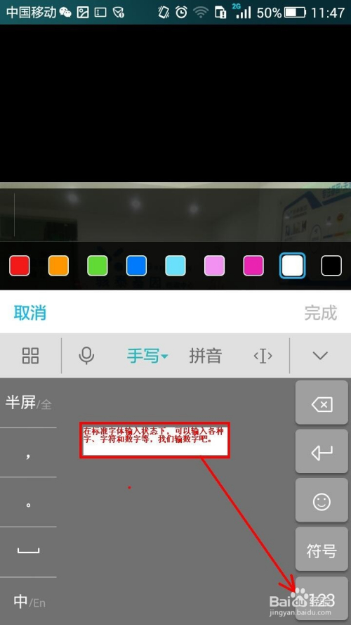 点击编纂条中的字母A,进入尺度字体输入状况。当然也可以在界面中直接手写,不外输入的字是手写体。颜色下面有7种可本身选择。