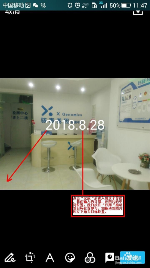 点击“完当作”后进入到这个界面。我们输入的日期,在图片的中心位置。我们按住“日期”拖动到方针位置即可。如拖动到图片的左下角为方针位置。