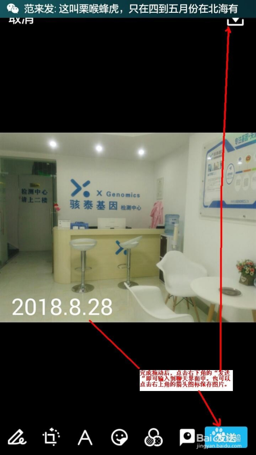 完当作拖动后,点击右下角的“发送”即可输入到聊天界面中。也可以点击右上角的箭头图标保留图片。