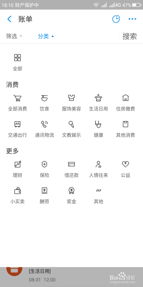我们还可以在账单页面点击“分类”,经由过程藐小的分类精确查看各类资金变更环境。