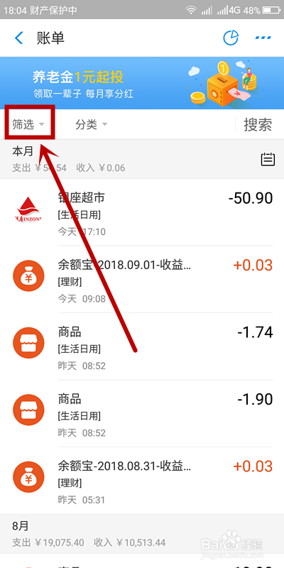 当然,我们还可以在账单页面点击“筛选”经由过程本身的限制前提来筛选,做到邃密化查看账单。